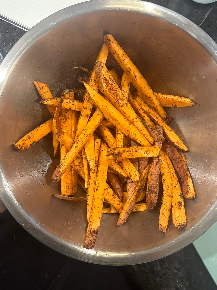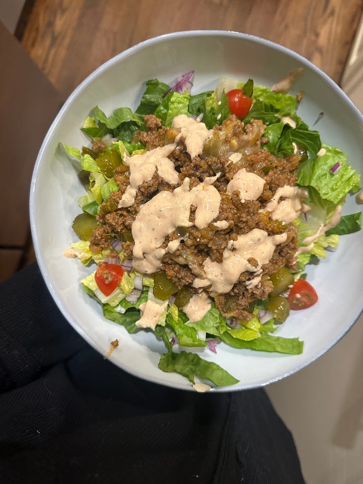 Cheeseburger salad - I don’t really follow a recipe for this. I was inspired by Baylee Nicole’s “Healthy but realistic what I eat in a day” TikToks, love her content. I start by sweating out diced onions, garlic and peppers in a skillet. Next, I add the ground beef and brown it. While the ground beef is browning, I make a seasoning mixture consisting of: garlic powder, onion powder, paprika, s+p, dry mustard (adobo seasoning would also work here). Once the ground beef is browned, I add the seasoning mixture to the browned beef and then additionally add some fish sauce (or Worcestershire) and pickle juice until it’s seasoned to my liking. I serve on a bed of romaine with salad fixings (plus chopped pickles). When reheating next day, I typically heat up the ground beef in the microwave for about a minute and then add a slice of cheese to the top and back into the microwave for another minute so the cheese gets melty before putting it on the salad. For the dressing - I usually do a quick Thousand Island-esque sauce with Greek yogurt as the base (yogurt, chopped pickles, onion powder, garlic powder, ketchup, s+p). For a side we will do air-fryer fries or sweet potato fries for something carby. So good and heats up really well.