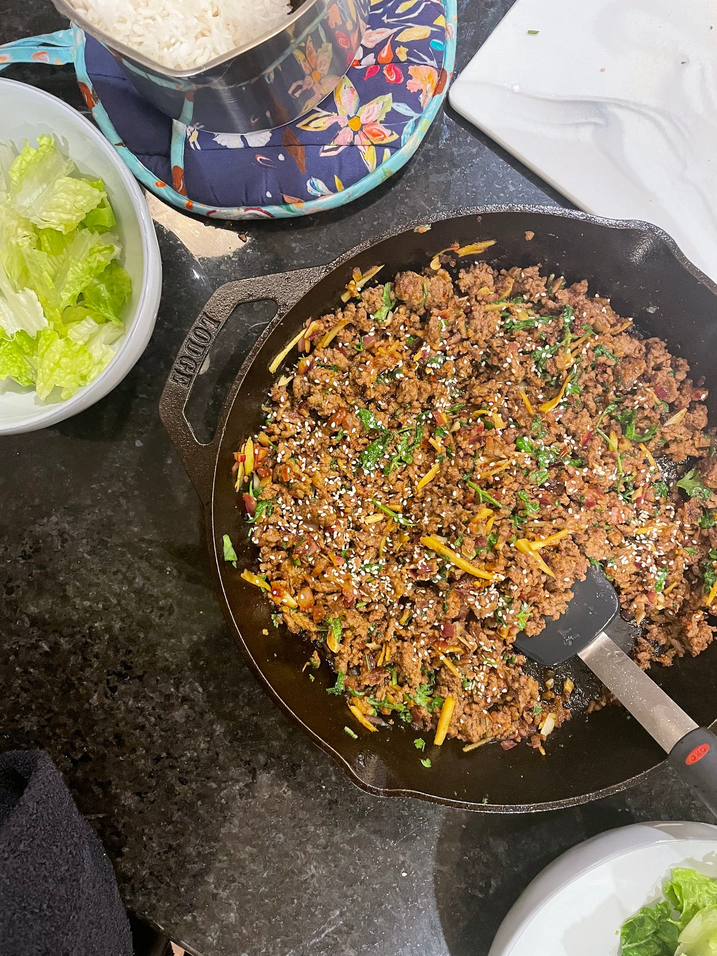 Ginger Beef Bowls by Carla Lalli Music - I tell anyone and everyone to make these bowls. It’s definitely on constant rotation in our house. There is a little bit of prep work with the ginger/onions/garlic. Also, if you haven’t cooked with Asian ingredients before, you may have to purchase a few ingredients, but they’re all pretty versatile and once you have on hand, it will be accessible moving forward. You can find the recipe in her cookbook here (in addition to the video above). I will typically scale this recipe up to cook around 3ish pounds of ground beef (Noah eats alot, like alot alot). Then I will typically serve it with some basmati rice and a smashed cucumber/spring mix salad situation. I garnish with sesame seeds, green onions and sriracha mayo (1 part mayo, 1/2 part sriracha, about 1T honey, salt, lots of pepper, pickle juice, adjust to your desired taste).