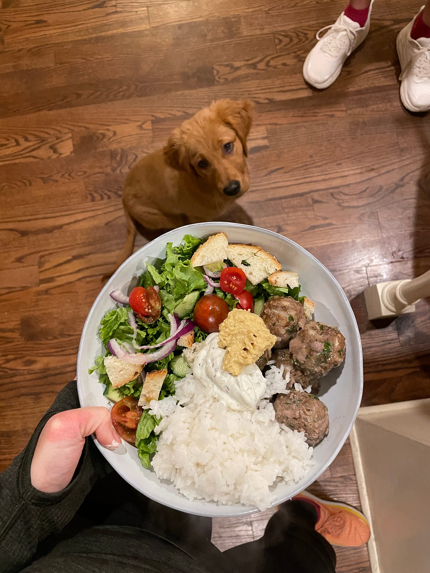 Deconstructed Mediterranean Meatballs - I love meatballs and I think in general they’re a great way to use ground beef. If I'm feeling ambitious, I will make a quadruple batch of these Greek meatballs and then keep them in the freezer, pull them out as needed and bake. However, I have been feeling very lazy lately, so I basically just make “deconstructed'“ meatballs, based off this HBH recipe. I loosely follow the ingredients and cook similar to the hamburger beef annotated above. I also have za’atar seasoning that I will toss into the ground beef. I serve (you guessed it) in a bowl with greens (and whatever other veggies I have) and rice. I also will make tzatziki sauce to top it (Greek yogurt, lemon juice, dill, finely diced garlic, salt as needed, and finely diced cucumbers). If you have some naan bread lying around, it would be a good move warm it up and serve alongside the bowl